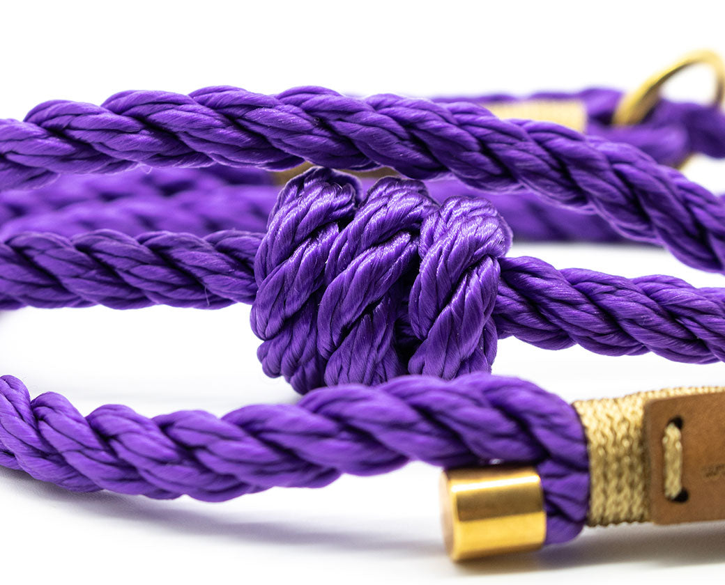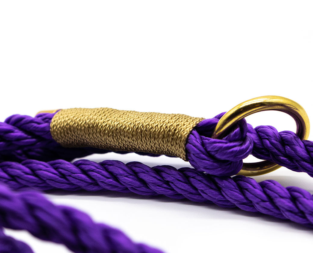 Handgefertigte Retrieverleine „Eleonora“ aus 8mm gedrehtem Tauwerk – lila mit goldener Takelung & goldenen Details. Weich, griffig & individuell anpassbar.
