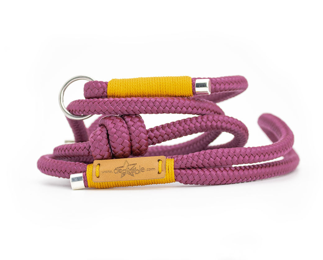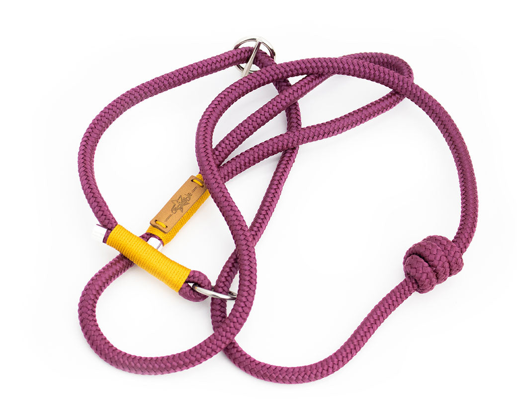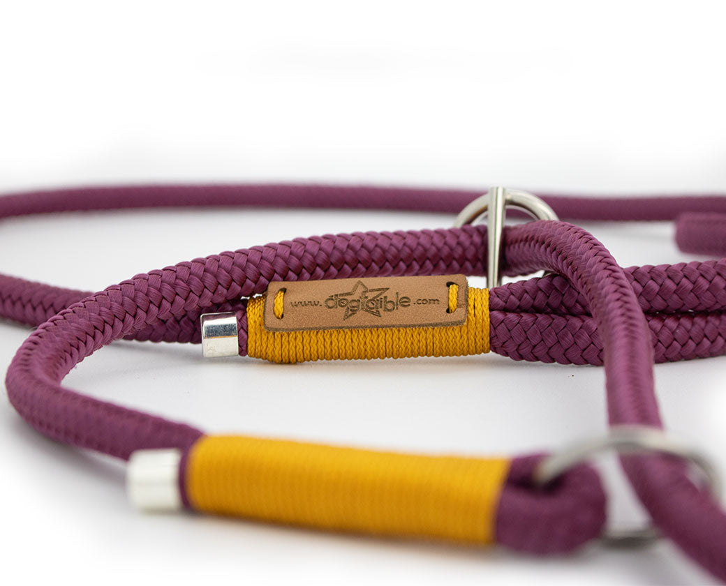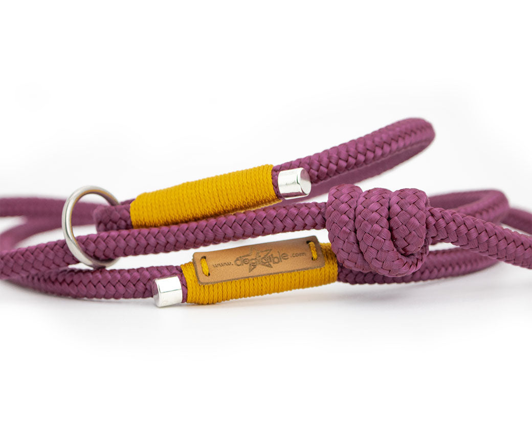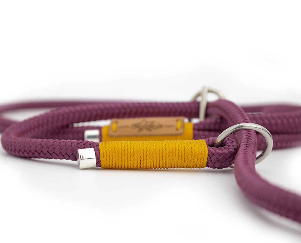 Handgefertigte Retrieverleine „Gloria“ aus 8mm Tauwerk – aubergine mit senffarbener Takelung & silbernen Details. Weich, griffig & individuell anpassbar.