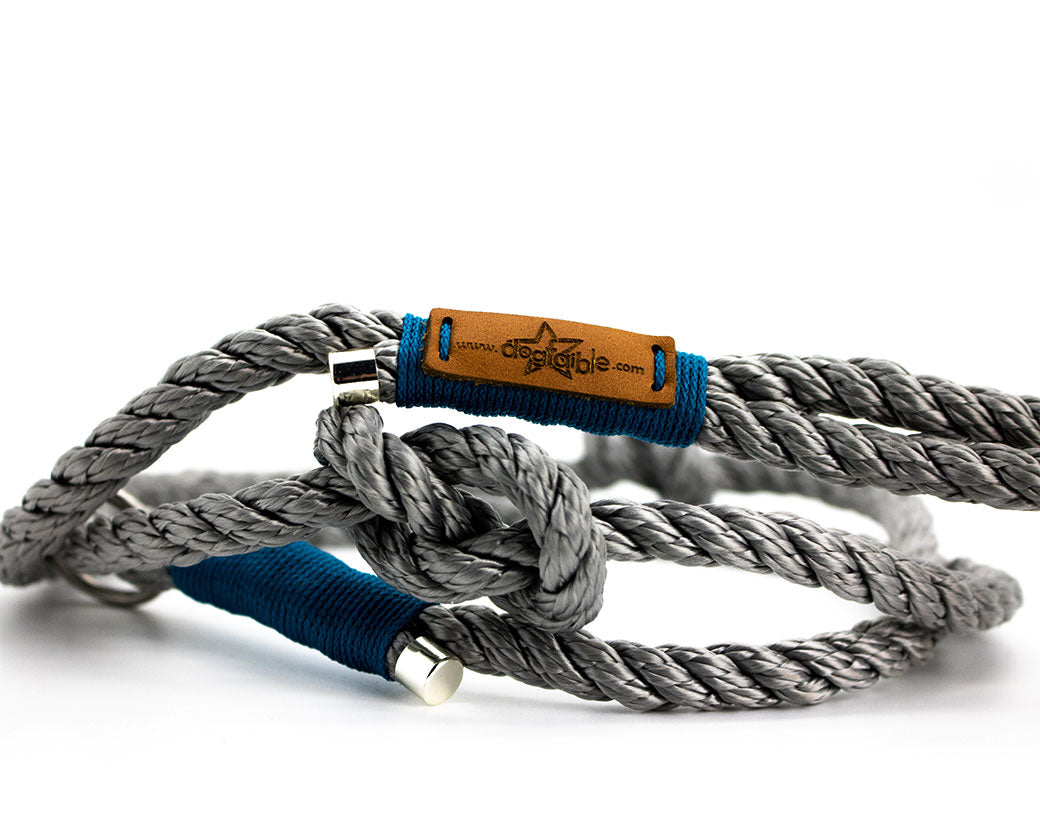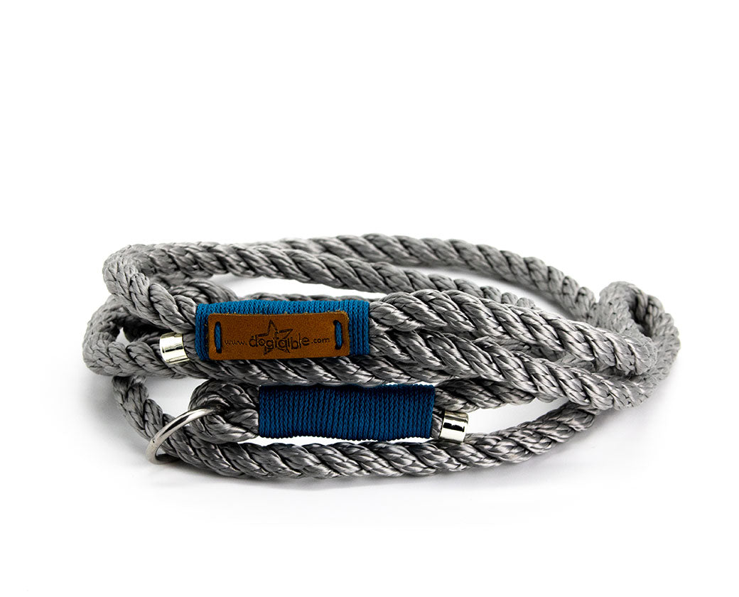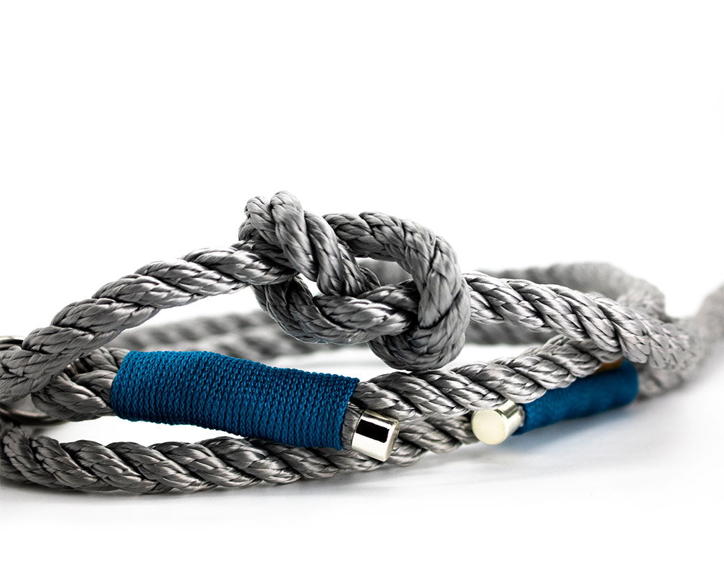 Handgefertigte Retrieverleine „Kolja“ aus 8mm gedrehtem Tauwerk – silbergrau mit einer meerblauen Takelung & silbernen Details. Weich, griffig & individuell anpassbar.