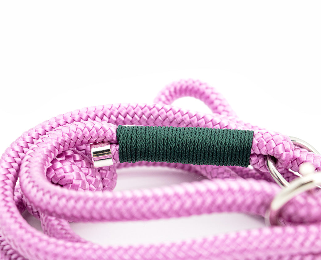 Handgefertigte Retrieverleine „Mina“ aus 8mm Tauwerk – ein wunderschönes Altrosa mit dunkelgrüner Takelung & silbernen Details. Weich, griffig & individuell anpassbar.