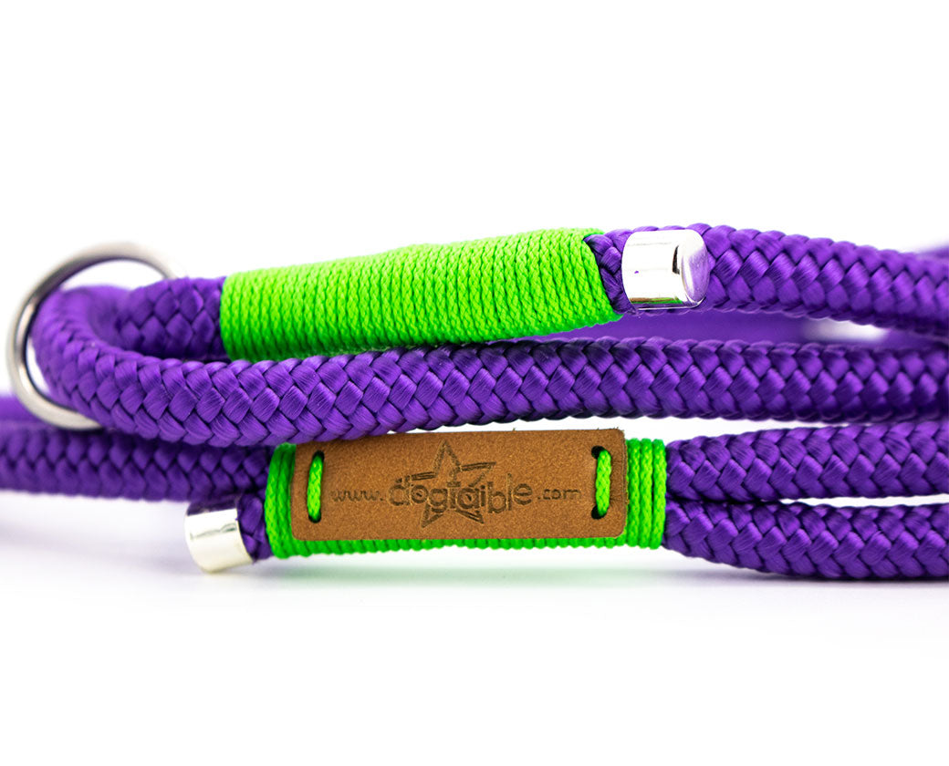 Handgefertigte Retrieverleine „Sina“ aus wahlweise 6, 8 oder 10mm Tauwerk – lila mit kräftig hellgrüner Takelung & silbernen Details. Weich, griffig & individuell anpassbar.