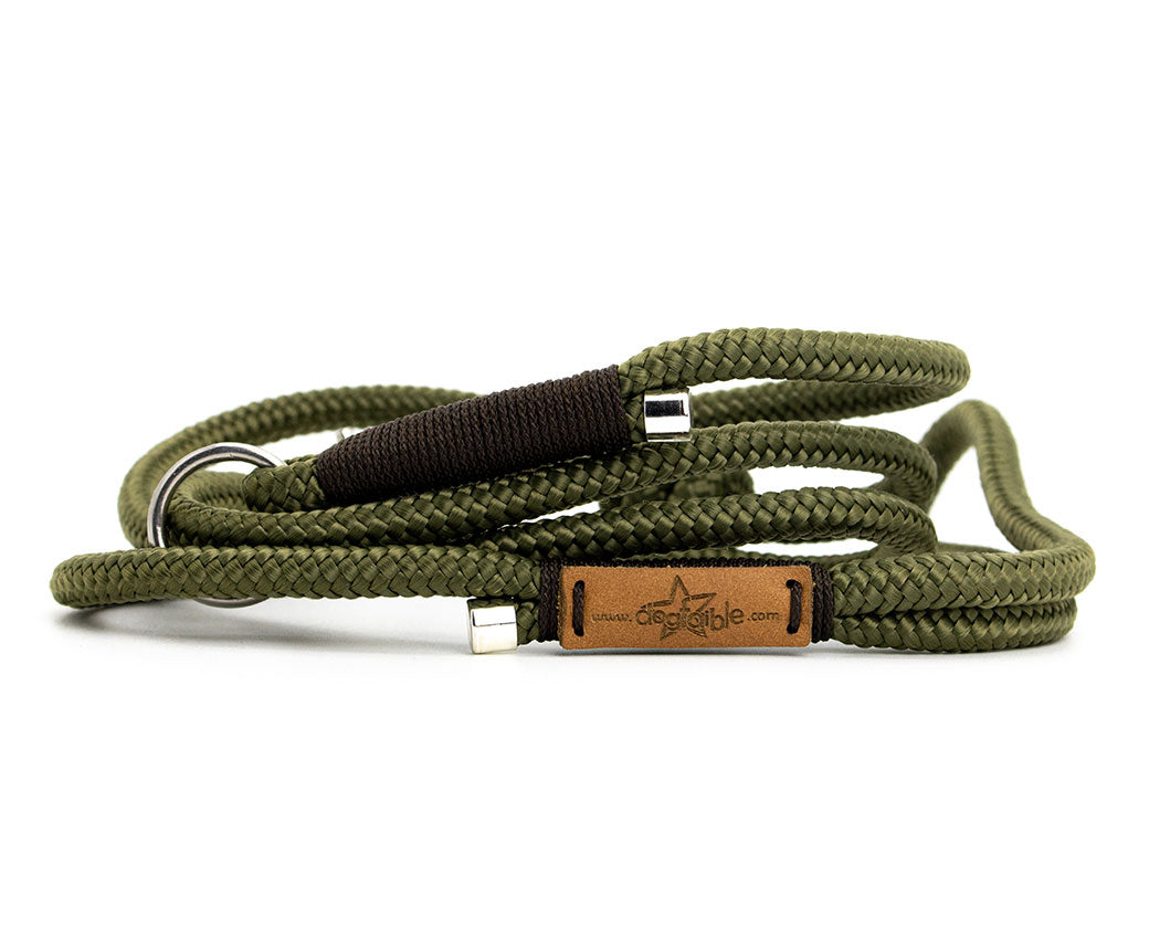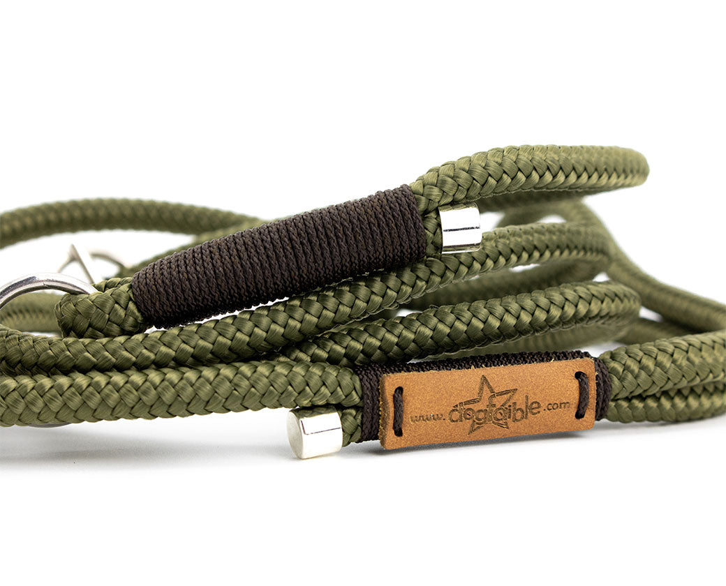 Handgefertigte Retrieverleine „Orion“ aus 8mm Tauwerk – dunkelgrün mit neonorangener Takelung & silbernen Details. Weich, griffig & individuell anpassbar.