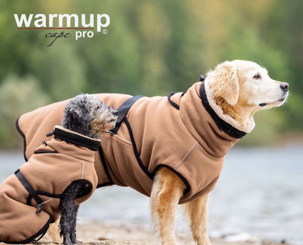 Nach der Jagd, dem Training, dem Seminar oder der Prüfung, wenn Dein Hund nass oder erhitzt im kalten Auto oder auf kühlem Untergrund liegen & warten muss, ist er mit dem warmup© cape pro bestens eingepackt!