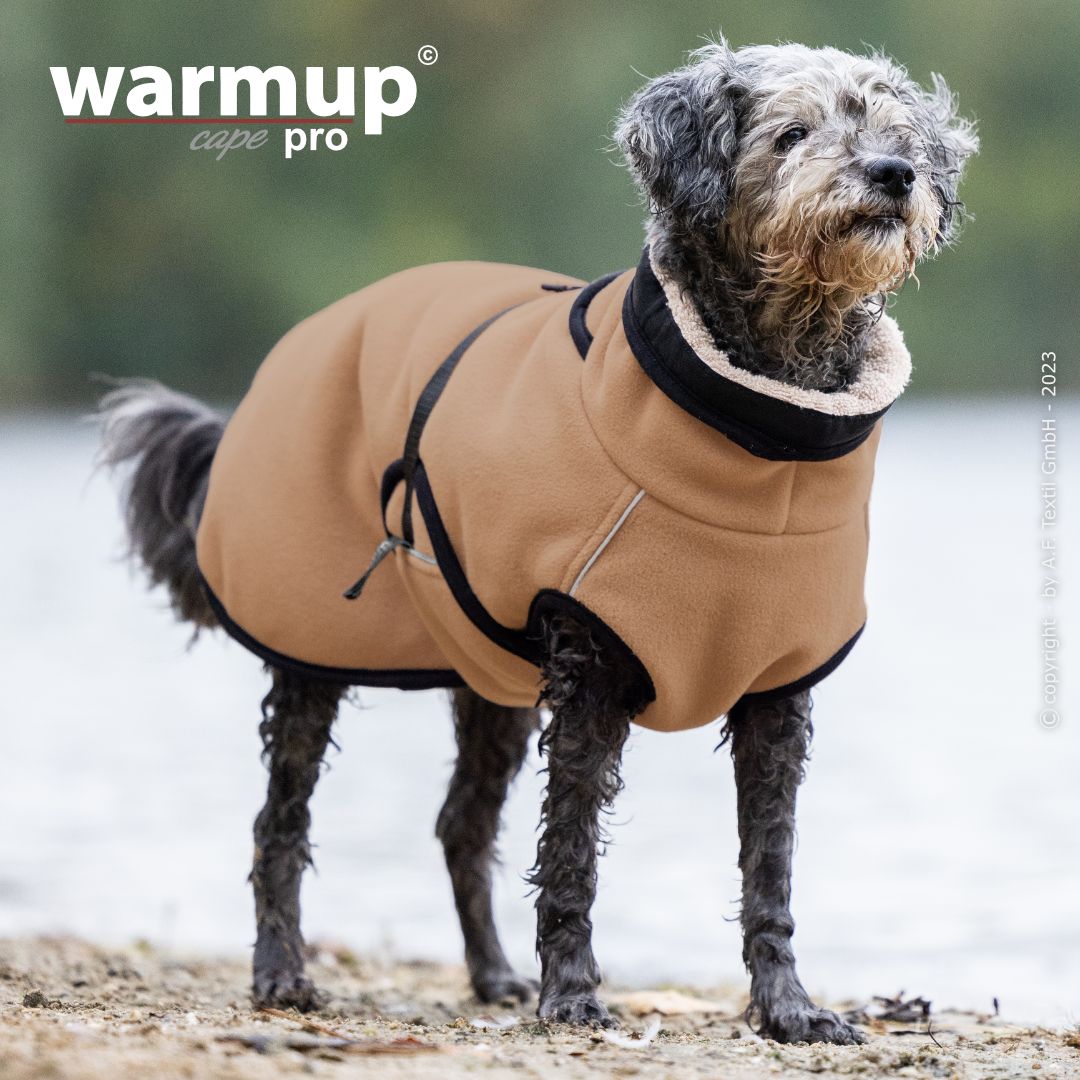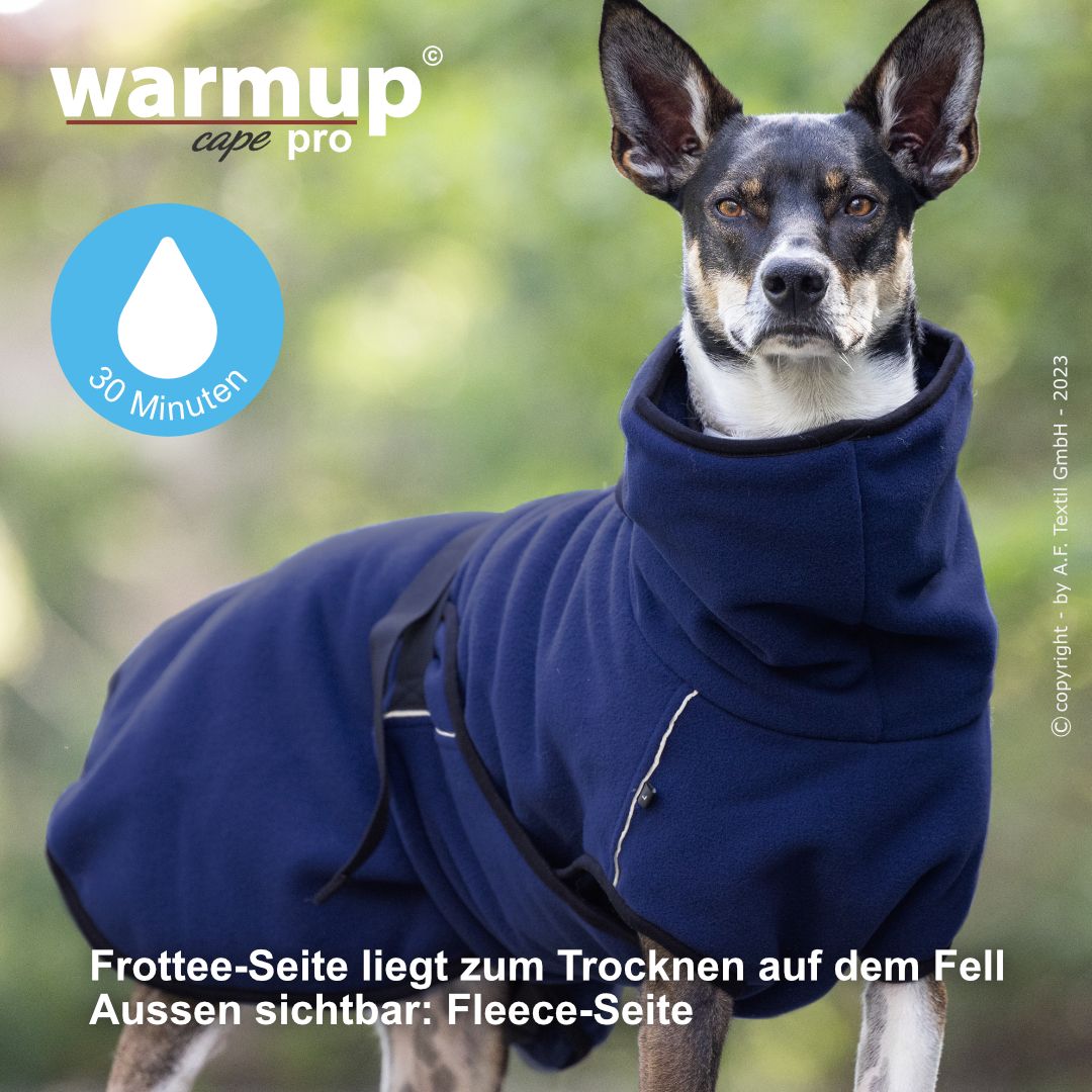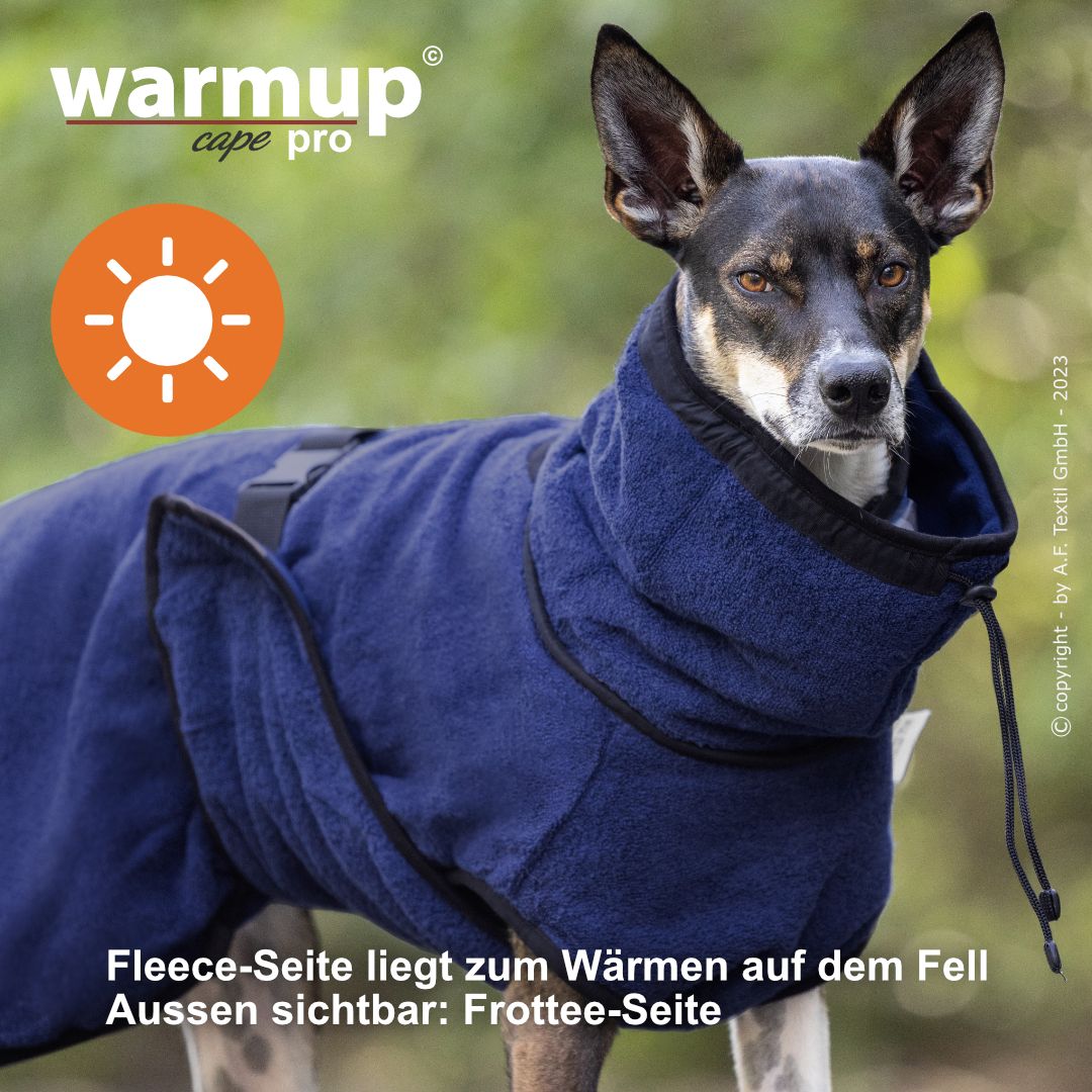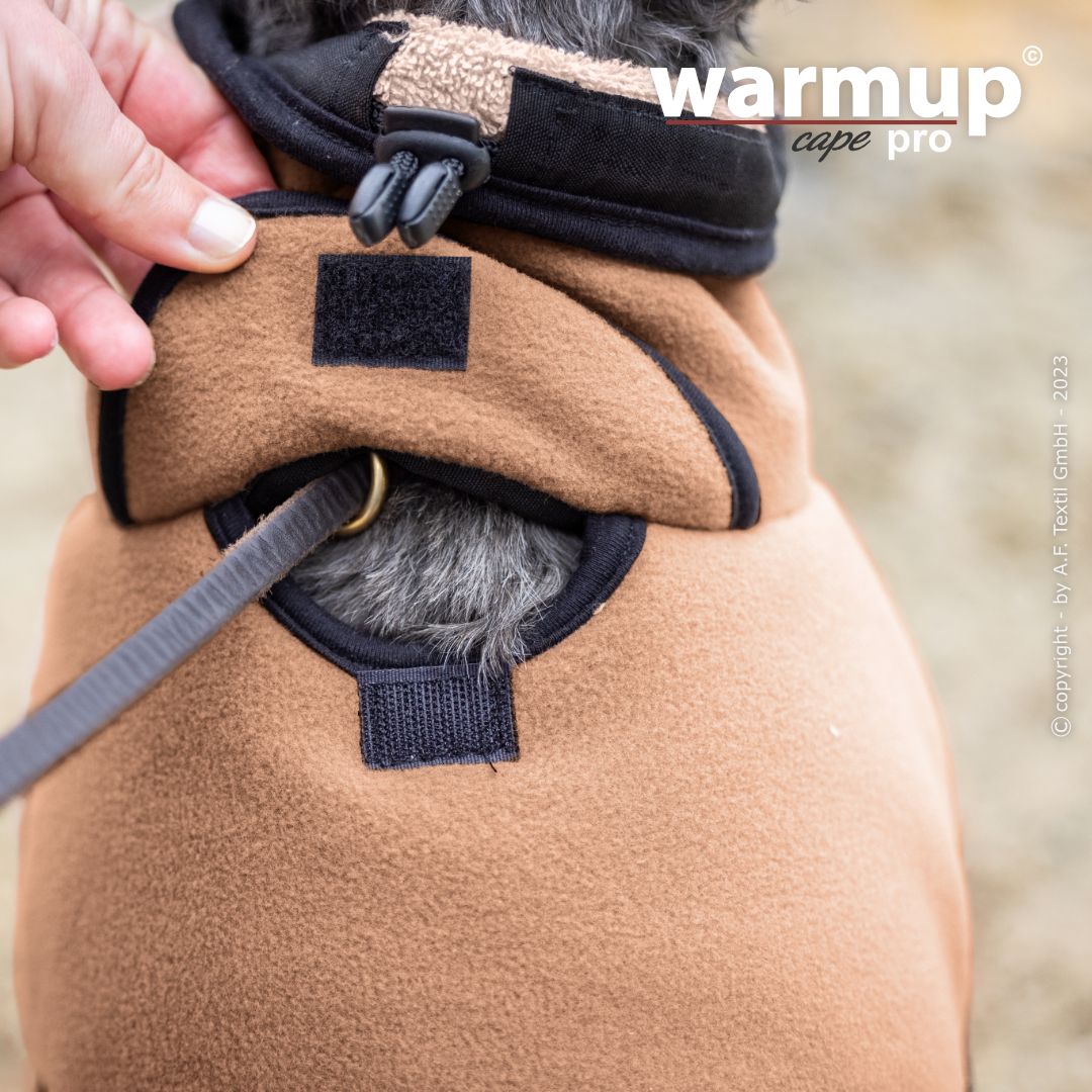 Aus dem bewehrten warmup© cape plus wurde das warmup© cape pro mit einem angeschnittenen Bauchlatz & großem Kragen, der auch die empfindliche Halspartie Deines Hundes umschließt & wärmt.