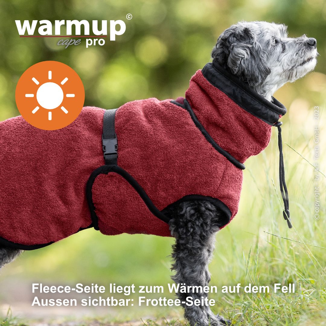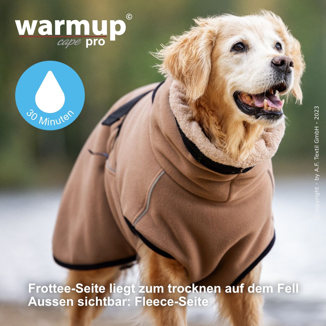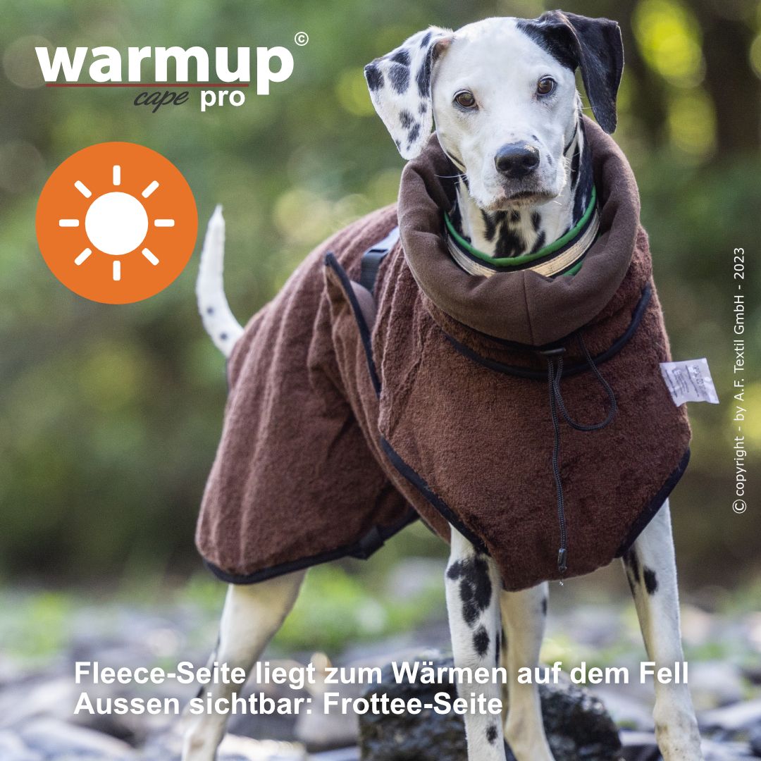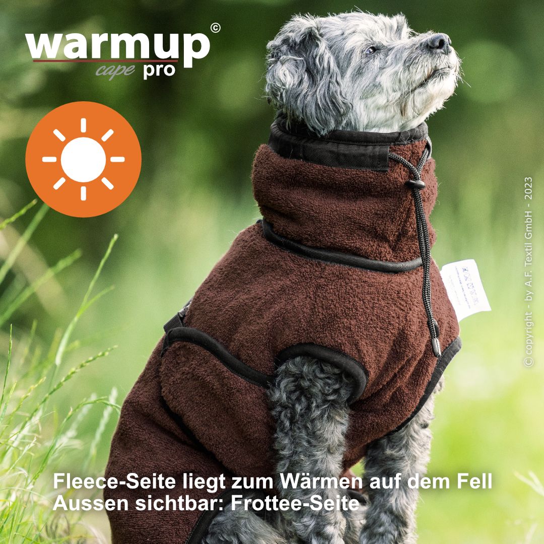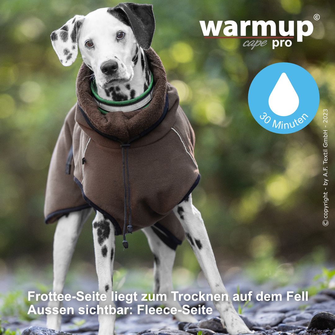 Aus dem bewehrten warmup© cape plus wurde das warmup© cape pro mit einem angeschnittenen Bauchlatz & großem Kragen, der auch die empfindliche Halspartie Deines Hundes umschließt & wärmt.
