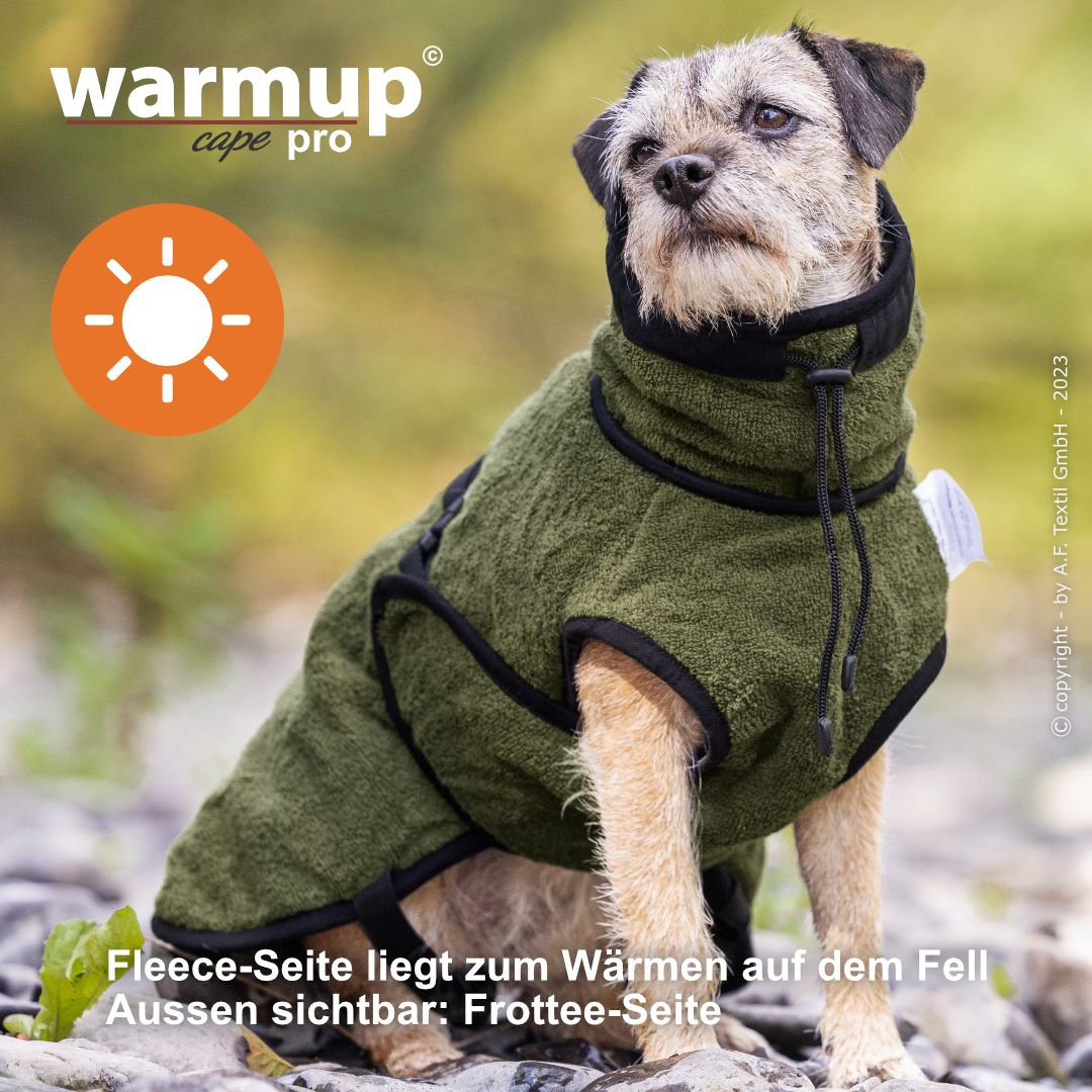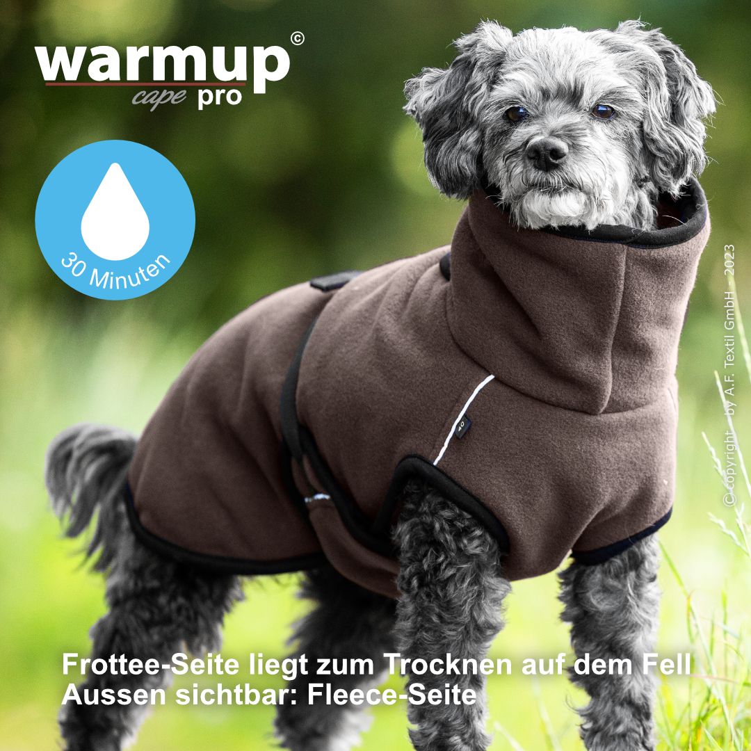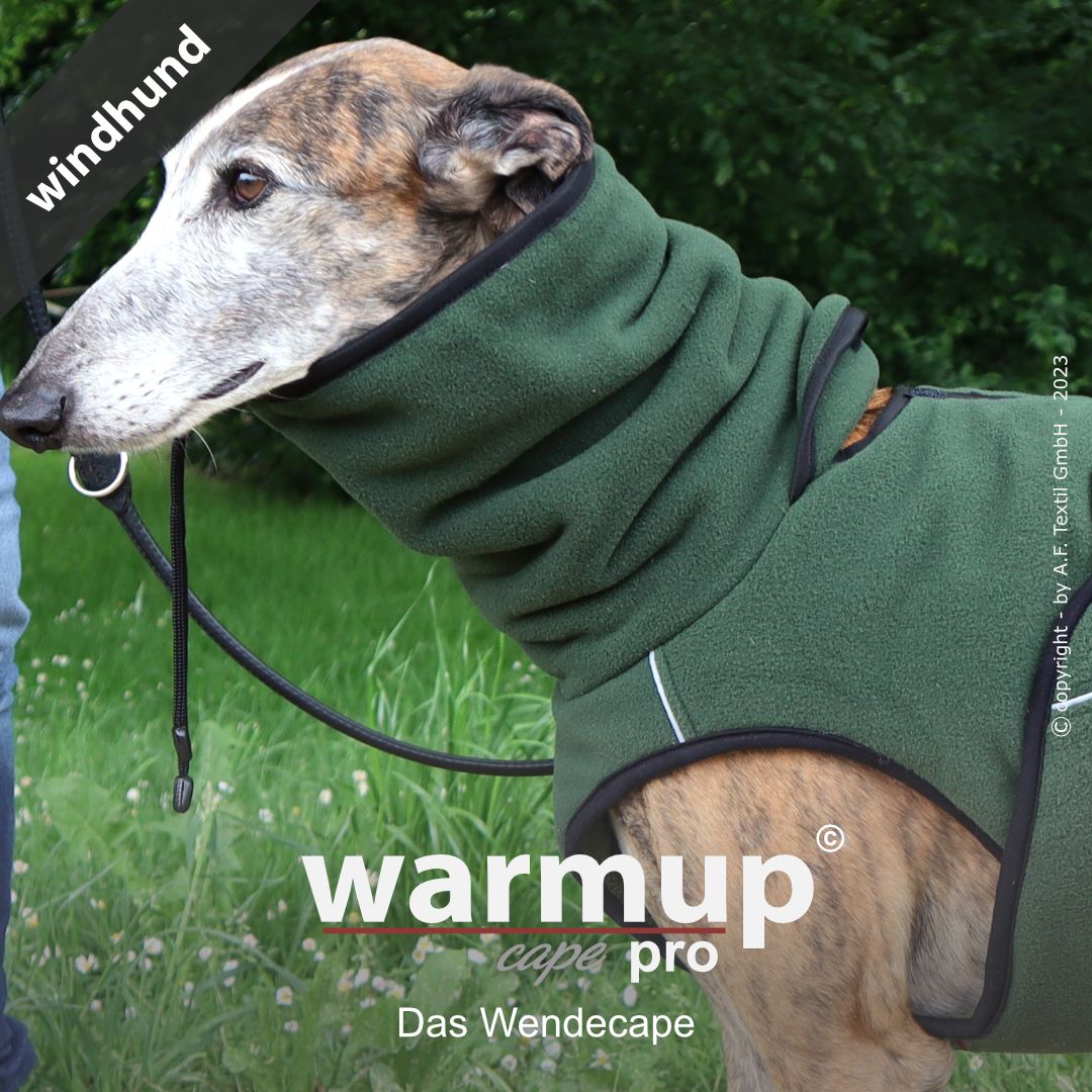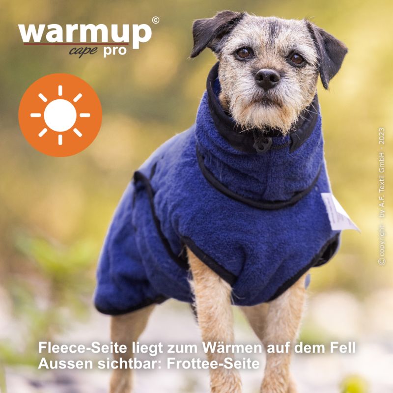 Aus dem bewehrten warmup© cape plus wurde das warmup© cape pro mit einem angeschnittenen Bauchlatz & großem Kragen, der auch die empfindliche Halspartie Deines Hundes umschließt & wärmt.