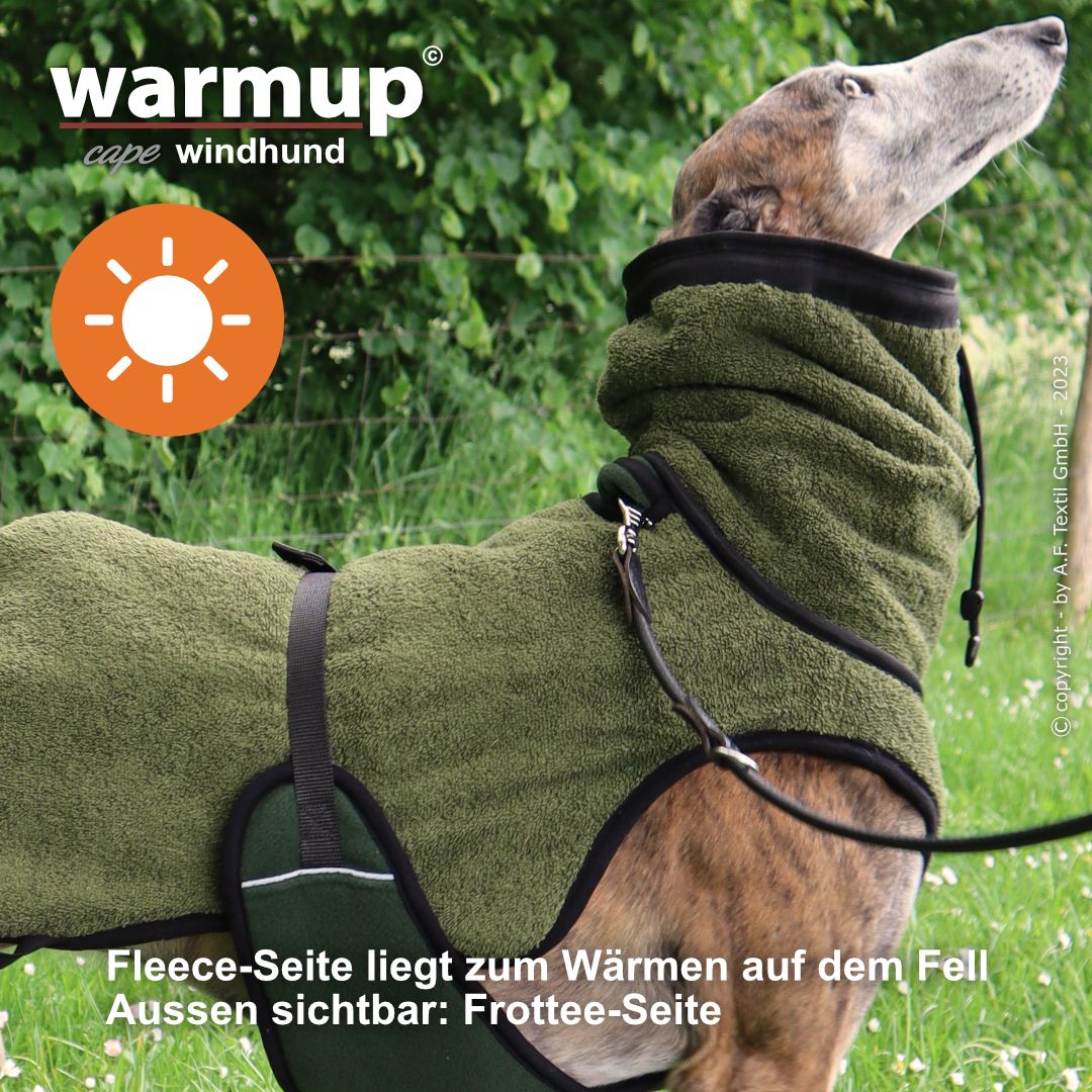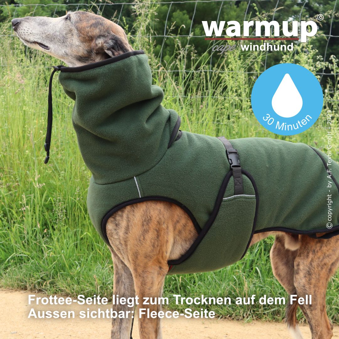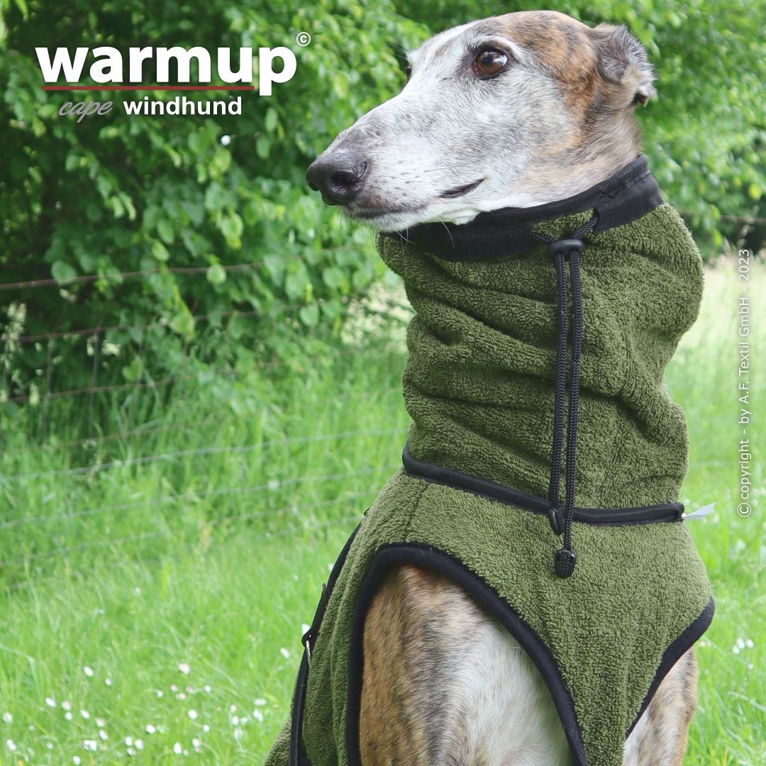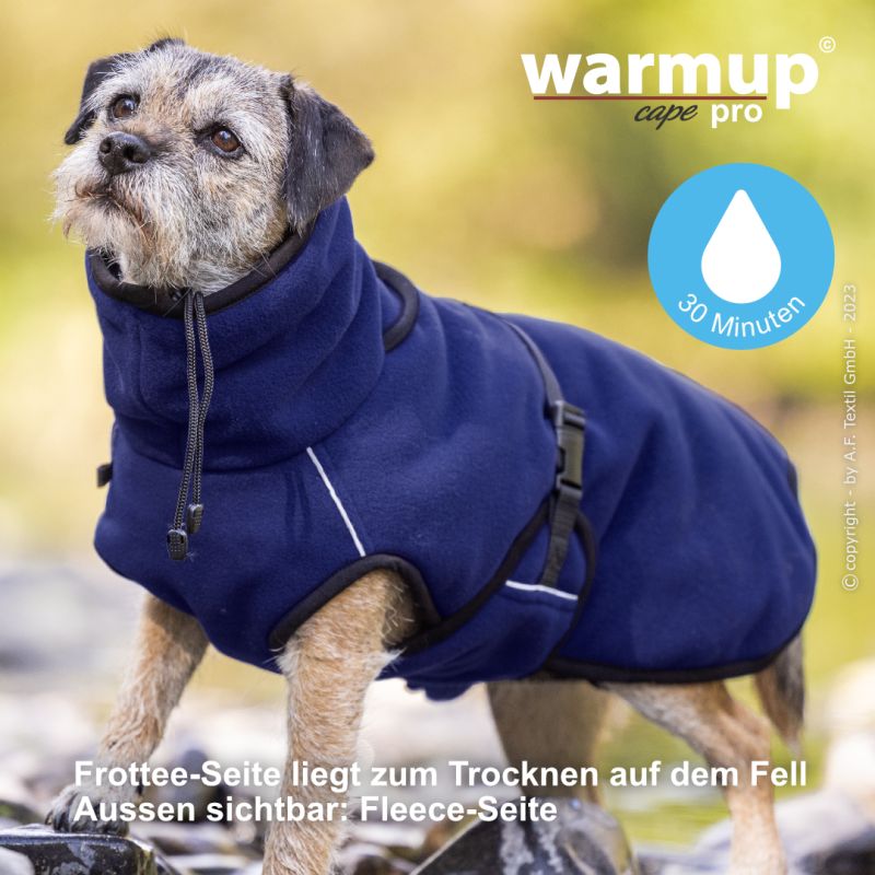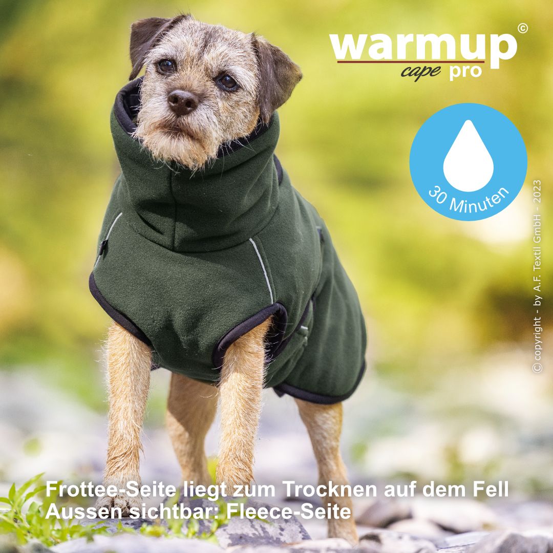 Aus dem bewehrten warmup© cape plus wurde das warmup© cape pro mit einem angeschnittenen Bauchlatz & großem Kragen, der auch die empfindliche Halspartie Deines Hundes umschließt & wärmt.